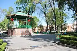 The city center is compact and filled with colonial era building painted in colors such as burnt umber, salmon pink and mustard yellow.[3] Most of these buildings are centered on the main square called the Plaza de la Constitución. This square measures 75 metres (246 feet) on each side and was established when the Spanish laid out the city in 1524. The current name was given in 1813 to honor the Cádiz Constitution as well as the Mexican constitutions of 1857 and 1917. In the center of this square is the Santa Cruz Fountain which was donated to the city by Philip IV in 1646. There is also a kiosk which was constructed in the 19th century.[4]
