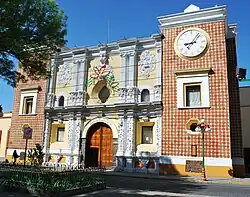 Significant communities outside the municipal seat include Octolán, San Estebán Tizatlán, San Gabriel Cuauhtla, San Hipólito Chimalpa, San Lucas Cuauhtelupan and Santa Maria Acuitlapilco.[7] The Sanctuary of Our Lady of Ocotlán was consecrated in 1854 and in 1905 it was declared the parish church of Ocotlán. In 1907, it was declared a collegiate church and in 1957, it became a minor basilica. The church is in Tlaxcalan Baroque style characterized by the use of tile and red brick. The façade is built to look like an altarpiece and topped with a seashell image. The main entrance is an arch flanked by estipite and Salomonic columns with have images of the doctors of the church, as well as the twelve Apostles. Saint Joseph appears in the arch. Above this is a figure representing the Immaculate Conception and Francis of Assisi. Near this is the choral window in the form of a stylized star. The towers were construction in the latter 18th century with arches and vegetative decoration. The cupola contains four mirrors with the cornice covered in gold leaf. The ante-sacristy has five oil paintings by Manuel Caro done in 1781 depicting scenes of some of the Virgin Mary's appearances. The sacristy has a painting of Saint Joseph by Joaquin Magón from 1754. The Guadalupe chapel to the side has lead figures of the Four Evangelists as well as paintings by Miguel Lucas Bedolla and Manuel Yañez. The image of the virgin is in a Baroque chamber decorated in plasterwork by Francisco Miguel Tlayoltehuanitzin between 1715 and 1740 and eight Salomonic columns.[1]