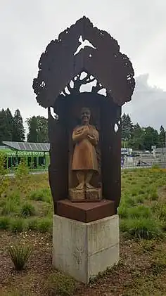 Portland artist Patrick Gracewood's To Grandmother's House is installed near the MAX Orange Line's Southeast Park Avenue MAX Station. Carved from a 75-year-old Atlas cedar tree over three years, the sculpture depicts an older woman holding a rabbit in her arms.[1] Additional materials include paint and weathering steel.[2] It was inspired by a photograph Gracewood took years before of his friend's German grandmother. The sculpture was installed on April 29, 2015 as the last of six artworks commissioned by TriMet near the MAX station, each created from trees cleared for the Orange Line.[1] Engineers set the piece on a cement pedestal, then placed it under a metal "treehouse",[2] or a canopy shaped like a tree.[1] According to Gracewood, To Grandmother's House "honors women and how they often hold communities together".[1]