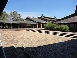 The scheme, as it evolved, became far more responsive to its unique setting, drawing greater inspiration from the "village environment" of the historic homestead complex, and closely integrated with the surrounding landscape. The formal enclosed quadrangle evolved into an open sided quadrangle that embraced the views over the Georgian homestead complex and its encircling lagoon. The location of the college was shifted northwards and lower on the ridge, in order to create a direct visual relationship with the Tocal Homestead complex and its meandering lagoons. At the same time, the revised location enabled the incorporation into the quadrangle of a fine copse of existing trees, and was closer to the agricultural facilities, such as the dairy, poultry yards and the piggery located on the eastern side of Tocal Road near the river.[19][21] The axial relationship with the homestead was retained but relaxed, as indicated on the final Regional Plan.[22] The evolved scheme was consequently a unique response to its setting and far more dynamic. It also allowed for loose extendable planning along the eastern and western wings, with each of the main functional elements grouped around its own courtyard, echoing the greater quadrangle.[1][3]