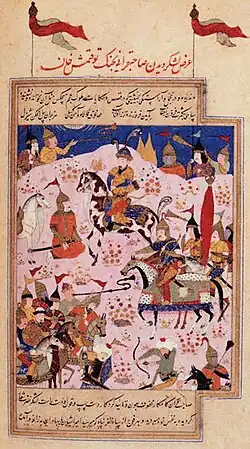 ![]() Depiction of Tokhtamysh in a 1391 battle with Timur, miniature from Zafarnama (1436) | |