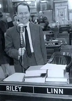 He was elected to the Iowa House in 1960, and served two terms, before being elected as one of the two Senators from the 20th district (Linn County); in 1968, he challenged incumbent Democrat John Chester Culver for congressman from Iowa's 2nd congressional district, but lost by 84,634 votes to Culver's 103,651. He returned to the Senate, and would serve through 1974, when he again ran for the 2nd District Congress seat, and lost to Democrat Mike Blouin with 73,416 for Blouin, 69,088 for Riley, and 1,108 for James Whitford of the American Party. He was succeeded in the Senate by Democrat James Redmond. He again ran in 1976 against Blouin, losing by 100,344 votes to 102,980 for Blouin, 485 for an American Party candidate, and 741 for an independent.[5]