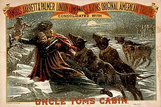 The version by Aiken is perhaps the best known stage adaptation, released just a few months after the novel was published. This six-act behemoth also set an important precedent by being the first show on Broadway to stand on its own, without the performance of other entertainments or any afterpiece.[4] Most of Aiken's dialogue was taken verbatim from Stowe's novel, and his adaptation included four full musical numbers written by the producer, George C. Howard.[5] Another legacy of Aiken's version is its reliance upon very different locations all portrayed on the same stage. This reliance led to large sets and set a precedent for the future days of film.[6] By focusing on the stark and desperate situations of his characters, Aiken appealed to the emotions of his audiences.[7] By combining this melodramatic approach with the content of Stowe's novel, Aiken helped to create a powerful visual indictment against the institution of slavery.