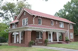 The Tom Watkins House is a historic house at Oak and Race Streets in Searcy, Arkansas. It is a two-story brick structure, with a cross-gabled tile roof and a concrete foundation. A porch extends across part of the front and beyond the left side, forming a carport. The main roof and porch roof both feature exposed rafter tails in the Craftsman style, and there are small triangular brackets in the gable ends. The house, a fine local example of Craftsman architecture, was built about 1920 to a design by Charles L. Thompson.[2]