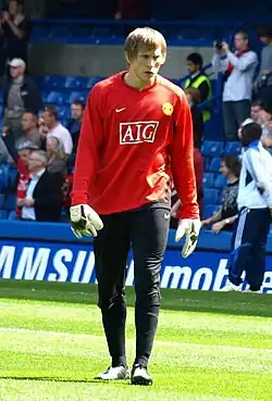 In September 2008, Kuszczak signed a two-year extension which would keep him at Old Trafford until 2012.[10] However, after being overlooked in favour of Foster for the 2009 League Cup Final, Kuszczak faced problems in aiming to become United's new first choice after Van der Sar's retirement and expressed discontent with his situation at Manchester United. In 2009, he was said to be considering his long-term future at the club.[11] Kuszczak kept a clean sheet in his first game of the 2009–10 season, a 1–0 home win over Wolverhampton Wanderers in the third round of the League Cup. After Van der Sar suffered an injury, Kuszczak returned to the side for a match against Portsmouth on 28 November. He retained his position in the starting line-up for United's League Cup fifth round match against Tottenham Hotspur, the next league game against West Ham United and the last game of the Champions League group stage against Wolfsburg. Kuszczak kept another clean sheet in United's final game of the decade as they beat Wigan Athletic 5–0 at Old Trafford. However, Van der Sar's return to the team in January 2010 saw him lose his place in the side. He started, however, in the 2010 Football League Cup Final against Aston Villa, which saw him fail to save a penalty in the first minutes of the game, although United went on to win the trophy, after a 2–1 victory.