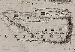 Josephus distinguishes between the monuments of Queen Helena (located "three stadia outside the walls of Jerusalem") and the Tombs of the Kings, being situated a little further distance away from the monuments.[18] For this reason, Italian architect and engineer, Ermete Pierotti, thought that St. Stephen's Basiica marked the site of the tomb of Queen Helena, particularly after he discovered there a pyramidal rock formation and what resembled sepulchres.[19]