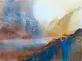 Smibert's art reflects three diverse streams of thought: Japanese minimalism, the early 19th century English School of Painting and Abstract Expressionism. He has been recognised as one of Australia's leading watercolourists.[4] His 1993 collaboration with Japanese couturier Yasuhiro Chiji led to a signature range of high fashion, yūzen kimono based on Smibert's watercolours.[5] Some works (for example his Yosemite Valley watercolours and acrylics) are clearly inspired by the study of Turner, Caspar David Friedrich and the early 19th century philosophy known as the Sublime. For Australian landscapes Smibert sometimes uses local iron ore as pigment.[6] Smibert's art is deeply informed by his study in aikido. His larger acrylic abstracts use the energy flow ('ki') of aikido to create a broad calligraphy reminiscent of Franz Kline and Action Painting. Smibert's career includes exhibitions in Europe, South East Asia, Japan, the Americas and Australia.[6][7]