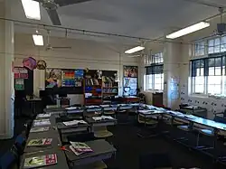 On both levels, the classrooms feature abundant natural light, simple timber joinery, and lofty ceilings. The corridors, cloak rooms, stairwells, and stairwells have smooth concrete ceilings, which is the original condition. The classrooms of the end wings retain the original sheets and battens lined ceilings but those of the centre wing are lined with recent flat sheet material and have modern cornices. The stairwells have simple iron balustrades with moulded clear-finished timber handrails and concrete stairs.[1]