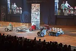 There were also 3D presentations during the show; for example MPH 2005, included a virtual and life-size 3D Apache helicopter shooting at a real Lotus Elise as it raced around the arena. Pyrotechnics added live explosions to the display, simulating missile hits and ricochets from gunfire; due to its success, it made a return appearance in 2006. MPH 2006 also included a virtual 3D Hummer being dropped out of an aircraft, shot down by a Tornado jet, and landing in pieces in the ocean. A 3D Gatso Camera/Dragon of the future battled it out with the Stig at MPH 2007.