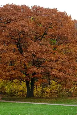 Before the arrival of European settlers, the landscape from Lake Ontario to the Oak Ridge Moraine was dominated by forests of maple, beech, and hemlock trees, while its low-lying areas were made up of forests and shrub swamps, with extensive marches along the Toronto shoreline.[8][10] A large number of the trees surrounding the Town of York were logged in the early 19th century, including many trees in the ravine system.[10][11] However, portions of the ravine system saw limited human developments, with flood-prone areas of the ravine having prevented large-scale urban developments.[12] As a result, the ravine system holds the largest collection of trees in the city that predates European colonization.[10]