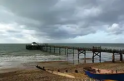The seabed is a mixture of mud and sand, clear of many underwater outcrops, this makes it a popular anchorage point for vessels.[1] The beach is predominantly shingle. Since 2001 the quality of the beach has been high enough for it to be awarded the Seaside Award Flag. In the summer, litter and seaweed are removed each day, with the latter being composted by local farmers.[2] Currently, the pier is being refurbished to re-open the cafe which was there before.