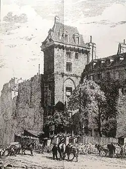 The tower, twenty-seven meters high, is attached to the wall of Philippe Auguste, and originally stood on the courtyard of the Hôtel de Bourgogne, and served as its entrance. Above the tower's main entrance is a much-eroded allegory of the "triumph of the House of Burgundy over Orléans and his clan."[1] The entrance to the tower was on the east side.