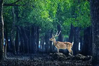 The evergreen forest[20] is situated by the river Goain and linked with the channel Chengir Khal. Most of the trees growing here are the Millettia pinnata (করচ গাছ "Koroch tree"). The forest is submerged under 20–30 feet water in the rainy season. For the rest of the year, the water level is about 10 feet deep.[21][22][23]