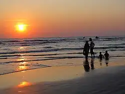 Cox's Bazar is a seaside town, a fishing port and district headquarters in Bangladesh. It is known for its wide and long sandy beach, which is considered by many as the world's longest natural sandy sea beach.[3][6] The beach in Cox's Bazar is an unbroken 125 kilometres (78 mi) sandy sea beach with a gentle slope. It is 152 kilometres (94 mi) south of the Chittagong Seaport. Cox's Bazar is also known by the name Panowa, whose literal translation means "yellow flower". Its other old name was "Palongkee".