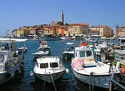 The town of Rovinj contains coastal areas with a number of small bays hidden within dense vegetation, open to naturists. Although the beaches are not specified as naturist, naturists frequent them.[24] The interior is green and wooded, with small stone towns on hills, such as Motovun. On the other side of the river lies Motovun forest, an area of about 10 square kilometres in the valley of the river Mirna, of which 280 hectares (2.8 km2) are specially protected. This area differs not only from the nearby forests, but also from those of the entire surrounding karst region because of its wildlife, moist soil, and truffles (Tuber magnatum) that grow there. Since 1999, Motovun has hosted the international Motovun Film Festival for independent films from the U.S. and Europe.[25] Grožnjan, another hill town, hosts a three-week jazz festival every July.