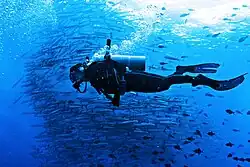 - Diving tours on the islands around Sabah, such as Sipadan, Ligitan or and Bohey Dulang Island are several famous islands for the beauty of their underwater nature. It is located in the Celebes Sea and Sulu Sea off the east coast of Sabah, Malaysia. Especially the island of Sipadan, it was formed by living corals growing on top of an extinct volcanic cone that took thousands of years to develop. Sipadan is located at the heart of the Indo-Pacific basin, the centre of one of the richest marine habitats in the world.[64] More than 400 species of fish and hundreds of coral species have been classified in this ecosystem. Frequently seen in the waters around Sipadan: green and hawksbill turtles[65] (which mate and nest there), enormous schools of barracuda in tornado-like formations as well as large schools of big-eye trevally, and bumphead parrotfish. Pelagic species such as manta rays, eagle rays, scalloped hammerhead sharks and whale sharks also visit Sipadan. A turtle tomb lies underneath the column of the island, formed by an underwater limestone cave with a labyrinth of tunnels and chambers that contain many skeletal remains of turtles that become lost and drown before finding the surface.[66] Visiting Sipadan Island requires a permit issued by Sabah Parks, a Sabah Government agency. Since 2019, there are 178 permits available each day.[67]