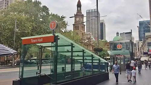 Town Hall railway station is a heritage-listed[1] underground suburban rail station located in the centre of the Sydney central business district in New South Wales, Australia. The station opened on 28 February 1932.[4] It is named after the Sydney Town Hall, located directly above the station.
