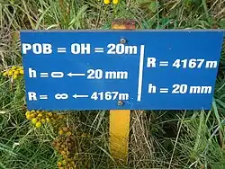 This sign aside a railroad (between Ghent and Bruges) indicates the start of the transition curve. A parabolic curve (POB) is used.