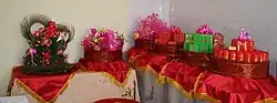 Traditional Vietnamese wedding gifts from the groom's family to the bride's family: Betel & Areca catechu, tea box, Bánh cốm, Bánh phu thê