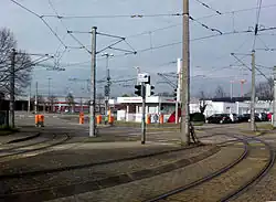 In 1950, the connection between Schwabentorbrücke and Lorettostraße lost its line traffic, but remained as an operational route to the depot until 1959.[26] Line 5 experienced a further 300 m extension from Immentalstraße to St. Urban church.[27] A further extension at Richard-Wagner-Straße and Hinterkirchstraße to Zähringen could not be implemented.
