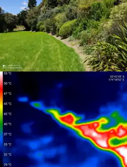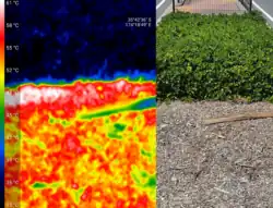 The images to the right were taken with a thermal lens mounted on a mobile phone alongside visual images for reference points. A 20 °C. plus temperature differential between vegetation and was often recorded.[16] The three images here pair thermal images and visual images. They reveal significant temperature differences between vegetated and bare surfaces. The image of the Coronation Reserve shows an areas of turf and the margin of native forest separated by a herbicide strip. The bottom image is a thermal image with a slightly different perspective, mainly caused by different camera lenses. The key information distilled from these images is the temperature differences. The grass and the forest margin have similar heat signatures. Temperatures range from 29 to 37 °C. while the dividing herbicide strip reaches 53 °C. Note also the vehicle tracks in the top image with roughly proximate higher temperature readings in the bottom image with an 8 °C. differential. Over time vehicles compact soil structure leading to reduced plant growth, especially when vehicles drive on wet soils. This image reveals that turf can be as cooling as forest.