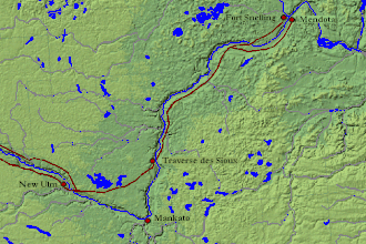 Nineteenth-century explorer John C. Frémont used the term Traverse des Sioux to refer to the crossing of the plain west of the river. Westbound travelers left the Minnesota River at the settlement of Traverse des Sioux and went directly west across the open prairie, leaving the shelter of the wooded riverbank in order to shortcut the right-angle elbow of the river at Mankato. They returned to the river near the mouth of the Cottonwood River at modern New Ulm.[10]