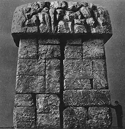 The central monument, designed by Franciszek Duszeńko, stands where the "new" gas chambers were located. Rising eight meters, it is constructed from unhewn granite blocks, evoking Jerusalem's Western Wall. A vertical fissure runs through its front (western) face, resembling a crack. The monument is capped with a structure featuring reliefs on three sides – front and both laterals – depicting human figures with pained expressions,[37][38] titled Martyrdom, Women and Children, Struggle, and Survival, symbolizing the human tragedies that took place in the camp.[41] The cap's front face features hands raised in a blessing gesture, while the rear (eastern) face depicts a menorah.[37][38][41] A stone plaque in front bears the inscription "Never Again" in English, French, Hebrew,[d] German, Polish, Russian, and Yiddish.[e][37]