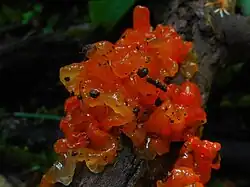 Tremella flammea, described from Japan by Yosio Kobayasi, is similarly coloured (scarlet to orange) but is said to be effused-lobate and have slightly smaller spores (5 to 5.5 by 4 to 5 μm).[5] It is not clear if it is a distinct species. Kobayasi later made a collection in New Britain which he identified as T. cinnabarina and considered synonymous with Tremella dahliana, which German mycologist Paul Hennings had originally described from the same location.[6][7]