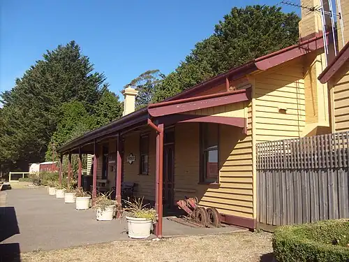 Since the closure of the line, the station building, platform and goods shed, and a short section of track, have all been retained. Tenants live at the station and look after it as a museum. The rail track still exists for 1 km on either side of the station, and some rolling stock has been put on display in the former station yard. Although the rest of the track has been removed, the railway reserve is still zoned for railway use, and the Daylesford Spa Country Railway has plans to restore the track to Trentham from its current terminus at Bullarto.[3]