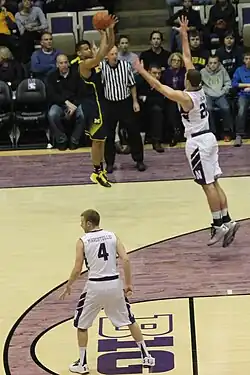 In his second game of the season, Burke tied his career-high with 9 assists in a November 12, 91–54 victory against the IUPUI Jaguars.[91][92] Burke earned the NIT Season Tip-Off tournament team recognition with 27 points and 10 assists total in the November 21 semi-final and November 23 final against Pittsburgh and Kansas State, respectively.[93][94][95] On November 27, Burke posted a career-high 11 assists, no turnovers and his first career double-double with 18 points in a 79–72 victory against number 18 NC State in the ACC–Big Ten Challenge.[96] For averaging 23.0 points, 6.5 assists, 4.5 rebounds and 2.0 steals with only 1 turnover in the games against Binghamton on December 11 and West Virginia on December 15, Burke earned Big Ten Player of the Week on December 17.[97][98][99] On December 29 against Central Michigan, Burke posted his second career double-double with 22 points and a career-high tying 11 assists with only 1 turnover.[100][101] In the subsequent game on January 3, he posted a game-high 23 points and a career-high 4 steals in a 94–66 victory in the 2012–13 Big Ten Conference men's basketball season opener against Northwestern.[102][103] On January 6, Burke posted 19 points and a new career-high 12 assists against Iowa, to earn his third career double-double.[104][105] On January 7, Burke was again recognized as Big Ten Conference Player of the Week.[106] The following day, he earned the Oscar Robertson National Players of the Week from the United States Basketball Writers Association.[107] On January 13, the team lost to Ohio State (#15 AP/#14 Coaches) snapping their winning streak. Burke missed a three-point shot with 17 seconds remaining that would have given Michigan a one-point lead. Michigan had been the only remaining unbeaten team and was expected to be ranked No. 1 if they had won.[108][109]