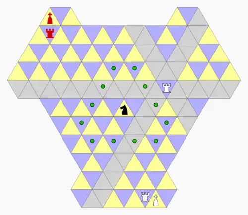 Tri-chess is the name of a chess variant for three players invented by George R. Dekle Sr. in 1986.[1][2] The game is played on a board comprising 150 triangular cells. The standard chess pieces are present, minus the queens, and plus the chancellor and cardinal compound fairy pieces per side.
