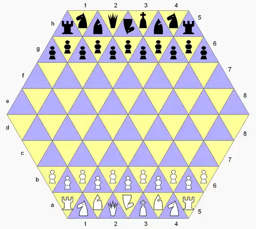 The starting setup is as shown. As in chess, White moves first, and the object is checkmate. Other standard conventions apply as well, including castling, the pawn's initial two-step move, the en passant capture, and promotion at the last rank. The triangular geometry, however, implies special move patterns for the pieces.