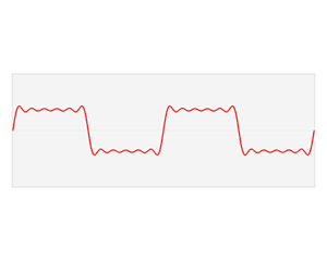 Function (in red) is a sum of six sine functions of different amplitudes and harmonically related frequencies. Their summation is called a Fourier series. The Fourier transform, (in blue), which depicts amplitude vs frequency, reveals the 6 frequencies (at odd harmonics) and their amplitudes (1/odd number).