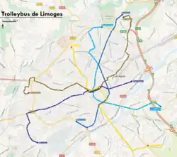 The Limoges trolleybus system (French: Réseau de trolleybus de Limoges) forms part of the public transport network of the city and commune of Limoges, in the Limousin region of the Great South West of France.