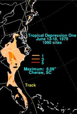 - ^ a b c David M. Roth (March 6, 2013). Tropical Depression One – June 13-18, 1979. Weather Prediction Center (Report). College Park, Maryland: National Oceanic and Atmospheric Administration. Retrieved May 23, 2014.