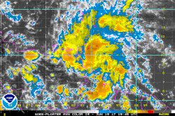 Convection continued to increase on June 19, and around 18:00 UTC, a reconnaissance aircraft investigating the low found a well-defined center. As a result, the low became Tropical Storm Bret at this time, while situated about 185 mi (300 km) east-southeast of Trinidad.[1] The NHC began advisories on Bret three hours later.[6] Upon its formation, Bret became the earliest named storm on record in the Atlantic basin's main development region.[1] Also upon developing, the cyclone attained its minimum barometric pressure of 1,007 mbar (29.7 inHg).[1] Bret moved swiftly westward towards Trinidad and Tobago at speeds of nearly 30 mph (48 km/h), an unusually fast pace for a tropical cyclone, especially at such a low latitude. The storm was not expected to intensify significantly or last long due to increasing vertical wind shear and land interaction with Venezuela.[6]