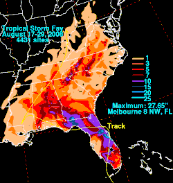 The two highest rainfall amounts recorded were 27.65 inches (702 mm) at Windover Farms, 8 miles (13 km) northwest of Melbourne, Florida, and 27.50 inches (698 mm) at Thomasville, Georgia.