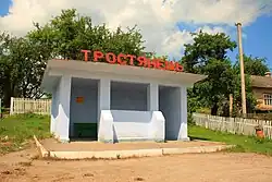 Trostianets (Ukrainian: Тростянець, romanized: Trostyanets, Russian: Тростянец, romanized: Trostyanets, Polish: Troscianiec, Troscaniec, Yiddish: טראָסטיניץ, romanized: Trostinits) is a village of 428 people in Ternopil Raion (county) of Ternopil Oblast of western Ukraine. It belongs to Saranchuky rural hromada, one of the hromadas of Ukraine.[1] Trostianets lies in the very heart of the historic region of Halychyna (Eastern Galicia). The current population is decreasing as a result of the remoteness of the village, and many houses are left empty. The village is located in a very remote forest area about 20 km south-west of Berezhany, among thick and large forests which provided the name for the village - Trostyanets (from "Troshchi," thick woods). The landscape is very picturesque, with a little brook in the village valley, surrounded by pasture hills on both sides. One hill's name is "Sus' hill" from the Tartar word "sus," swine. There was a fire post on that mountain which gave signs when the Tartars came to invade. There is a lake at the southern end of the village. The closest villages are Siltse (locally referred to as Siulko) and Bozhykiv (formerly Kvitkove).