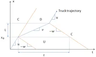 Truck lane restriction within transportation traffic engineering, is a factor impacting freeway truck lanes and traffic congestion. In traffic flow theory, intuitively, slow vehicles (e.g. trucks) will cause queues behind them, but how it relates to the kinematic wave theory was not revealed until Newell.[1] Leclercq et al [2] did a complete review of Newell's theory. In addition to the simulation models developed by Laval and Daganzo [3] on the basis of numerical solution methods for Newell's theory to capture the impacts of slow vehicle, Laval [4] also mathematically derived the analytical capacity formulas for bottlenecks caused by single-type of trucks for multi-lane freeway segments.