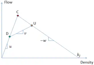 Laval's solution could be summarized as follows: Assuming a one-lane freeway segment obeying the triangular fundamental diagram defined in the figure to the right with free-flow speed u, wave velocity w and jam density kj. Only one truck type is considered. In this scenario, the normalized capacity I of the freeway segment is given as: