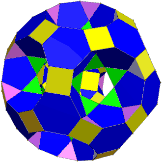 The name truncated icosidodecahedron, given originally by Johannes Kepler, is misleading. An actual truncation of an icosidodecahedron has rectangles instead of squares. This nonuniform polyhedron is topologically equivalent to the Archimedean solid.