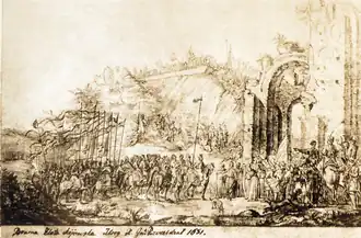 In 1652, hostilities resumed again where, however, the Cossacks annihilated the Polish forces at the battle of Batih.[10] The following year, fighting continued alternately until the siege of Zhvanets.[11] The biggest winner was not either side, but the Tatars, who, at the cost of betraying the Cossacks, made a deal with John Casimir.[note 2] The Cossack Hetman knew that, having such an untrustworthy ally, he could not count on him. After the battle itself, the Russian land council granted permission for the Cossacks to be incorporated into Russia.[12] Tsar himself doubted this for a long time, especially after Berestechko, but by February 1653 he had made a decision. On March 19, a decree was issued on the beginning of mobilization in Russia.[8] On the basis of the Pereiaslav Agreement, the entire sicha was incorporated into Russia.[13] At the Sejm in Warsaw, news of Khmelnytsky's deed was learned, but the deputies did not take quick steps to prepare for war. On the contrary, the Sejm was broken up and the country had no funds for defence.[14] This was a huge logjam that was to be revealed to the Lithuanians later. At that time, the tsarist forces were already concentrating for the offensive.[15]