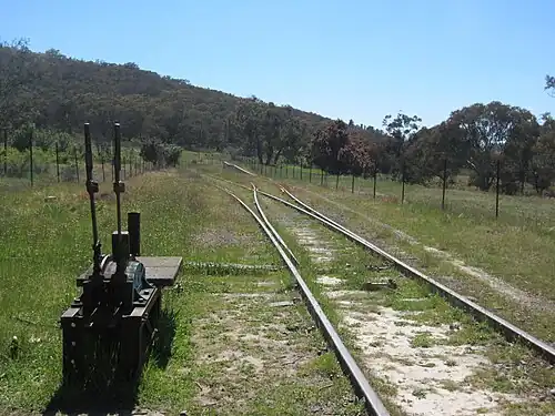 The railway line, siding, points, and loading ramp still exist near the former site of the station.[33] There is nothing left of the platform, station buildings, or other structures. Land on either side of the railway line, which was part of the original railway corridor, has been enclosed by fencing. That includes the land south of the line, which was formerly enclosed as stock pens for the loading ramp.[13] The NSW-ACT border is therefore at the locked gate across the road, south of the railway line, not at the closest fence line to the railway tracks.