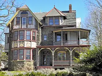 The Tulpehocken Station Historic District is a historic area in the Germantown neighborhood of Philadelphia, Pennsylvania. Large suburban houses were built in the area from about 1850 to 1900 in a variety of styles including Carpenter Gothic, Italianate, and Bracketed as part of the Picturesque Movement of architecture. In the 1870s styles moved toward High Victorian and Second Empire. The district was added to the National Register of Historic Places in 1985, and it covers about six square blocks, bounded by McCallum Street on the north, the Pennsylvania Railroad tracks on the south, Tulpehocken Street on the west, and Walnut Lane on the east. Thirty-seven buildings in the district are considered to be significant and 118 are considered to be contributing, with only 13 considered to be intrusions.[2]