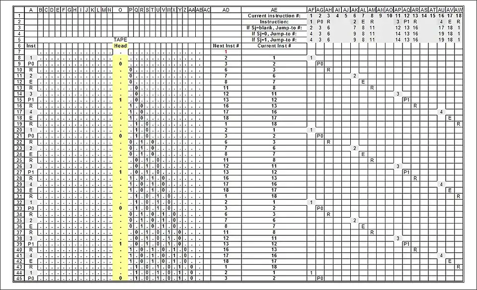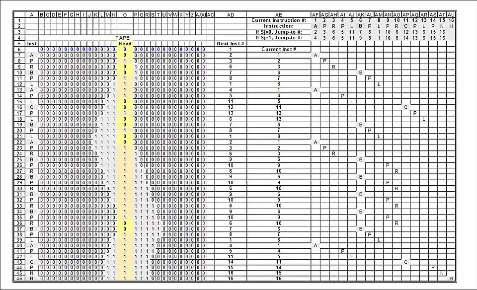 The full "run" of the 3-state busy beaver. The resulting Turing-states (what Turing called the "m-configurations" — "machine-configurations") are shown highlighted in grey in column A, and also under the machine's instructions (columns AF-AU)):
