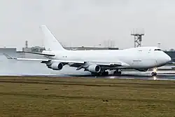 The aircraft involved, manufactured in February 2003, was a Boeing 747-412F,[note 1] registered as TC-MCL with serial number 32897.[3]: 31 The aircraft, originally registered as 9V-SFL, was first delivered to Singapore Airlines Cargo. After multiple periods of storage, the aircraft was acquired by LCI Aviation in 2015. It was leased it to Istanbul-based cargo company ACT Airlines, which then began operating it on behalf Turkish Airlines Cargo from 2017.[4] The aircraft had logged 46820 airframe hours in 8308 takeoff and landing cycles and its last C-check maintenance check had been completed on 6 November 2015. It was also equipped with four Pratt & Whitney PW4056-3 engines.[5][3]: 31–32