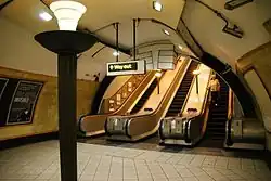 The station originally featured a large lamp standard and sign in the space in front of the station which was part of Holden's original design, but this has since been removed.[8]