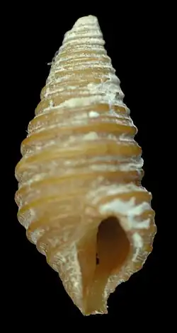 The spire is convex in outline, slightly acuminated towards the tip. The whorls are encircled throughout with tumid ridges. The shell is yellowish brown or reddish brown. The aperture has the same color.[2]