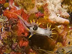 The twin-crowned nudibranch, scientific name Polycera sp., as designated by Gosliner, 1987, is a species of dorid nudibranch. It is a marine gastropod mollusc in the family Polyceridae. As of November 2009, it was undescribed by science.