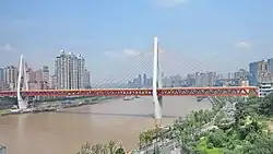 The Qiansimen Bridge (sometimes Qianximen Bridge) crosses the Jialing River with a cable-stayed main span that is 312 metres (1,024 feet), connecting the Jiangbei and the Yuzhong Districts. The placement of the single tower means that the cable-stayed back span of 240 metres (787 feet) provides a secondary channel for shipping. The bridge has a total length of 720 metres (2,362 feet) as it includes girder spans of 88 metres (289 feet) and 80 metres (262 feet). The bridge has nine pairs of cables. The Qiansimen Bridge has the longest stay cable of both bridges, measuring 256.85 metres (843 feet) long.[1] The bridge was shortlisted for an award by the Institution of Structural Engineers.[4]